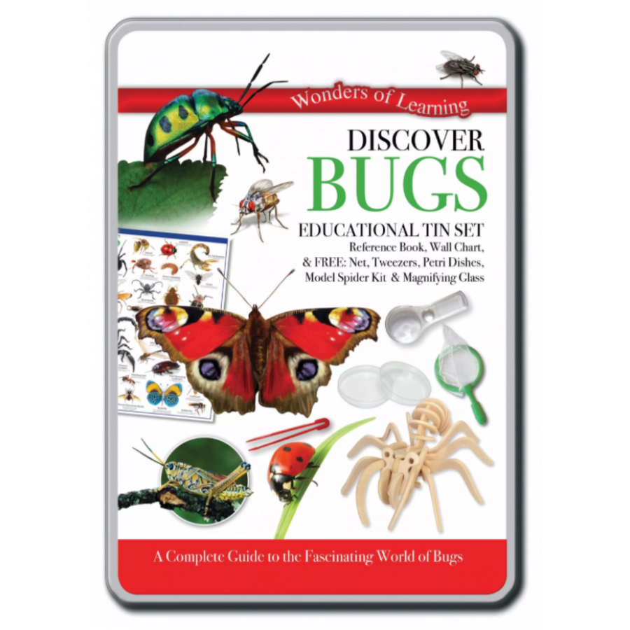 Discover Bugs Science kit includes an illustrated book, Wall chart, butterfly net, tweezers, petri dishes, magnifier and model spider kit.